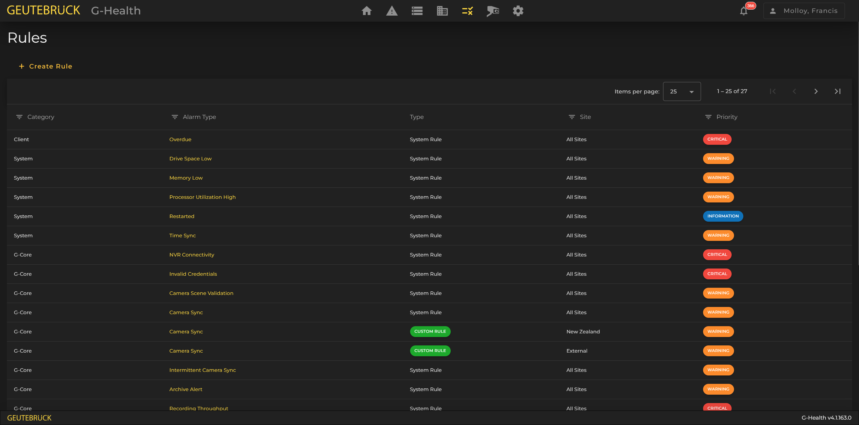 The rules in G-Health determine when an alarm is created on a client. After G-Health is installed, a default set of system rules are automatically created by the server.